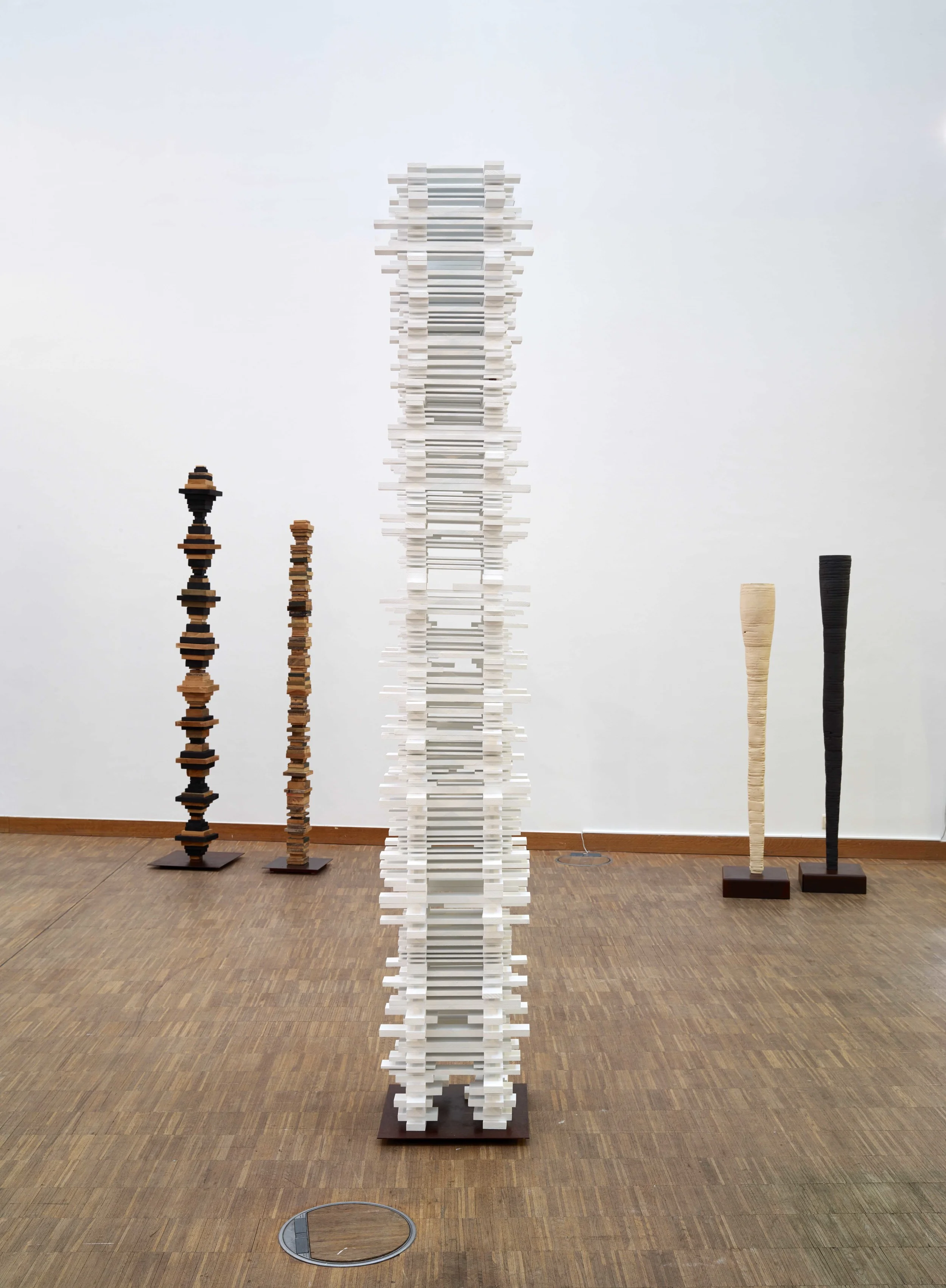 Beeld(b)ouwer Philip Van Hoeck bouwt zijn beelden door monotone vormen uit keramiek of hout, papier, plastic, ... op elkaar te stapelen.